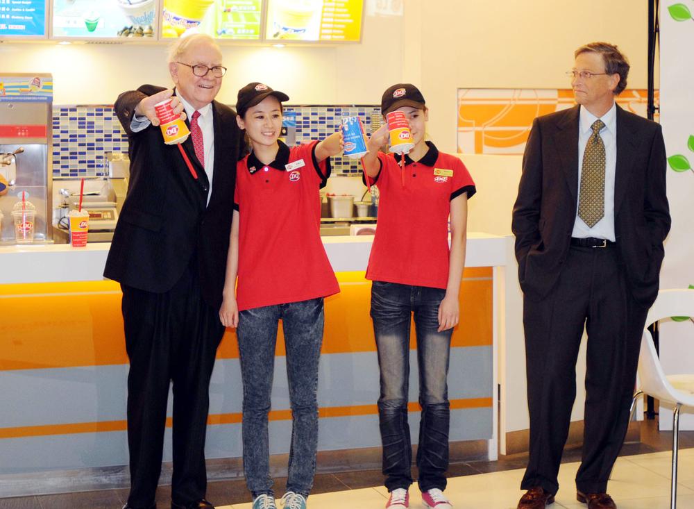 U.S. investor and philanthropist Warren Buffet and Chinese employees flip over cups of ice cream next to Microsoft co-founder Bill Gates during the opening ceremony of a Dairy Queen ice cream shop at the Joy City shopping mall in Beijing, China, 30 September 2010.
